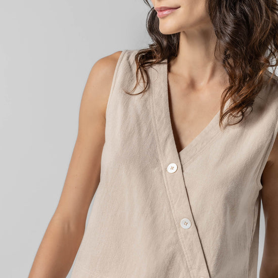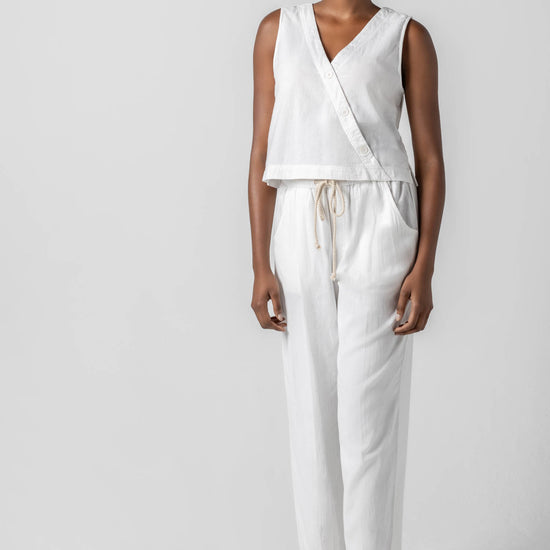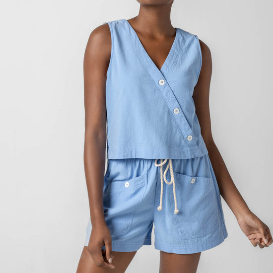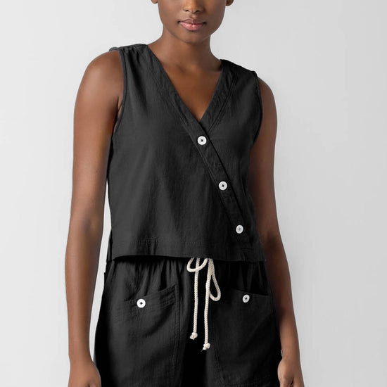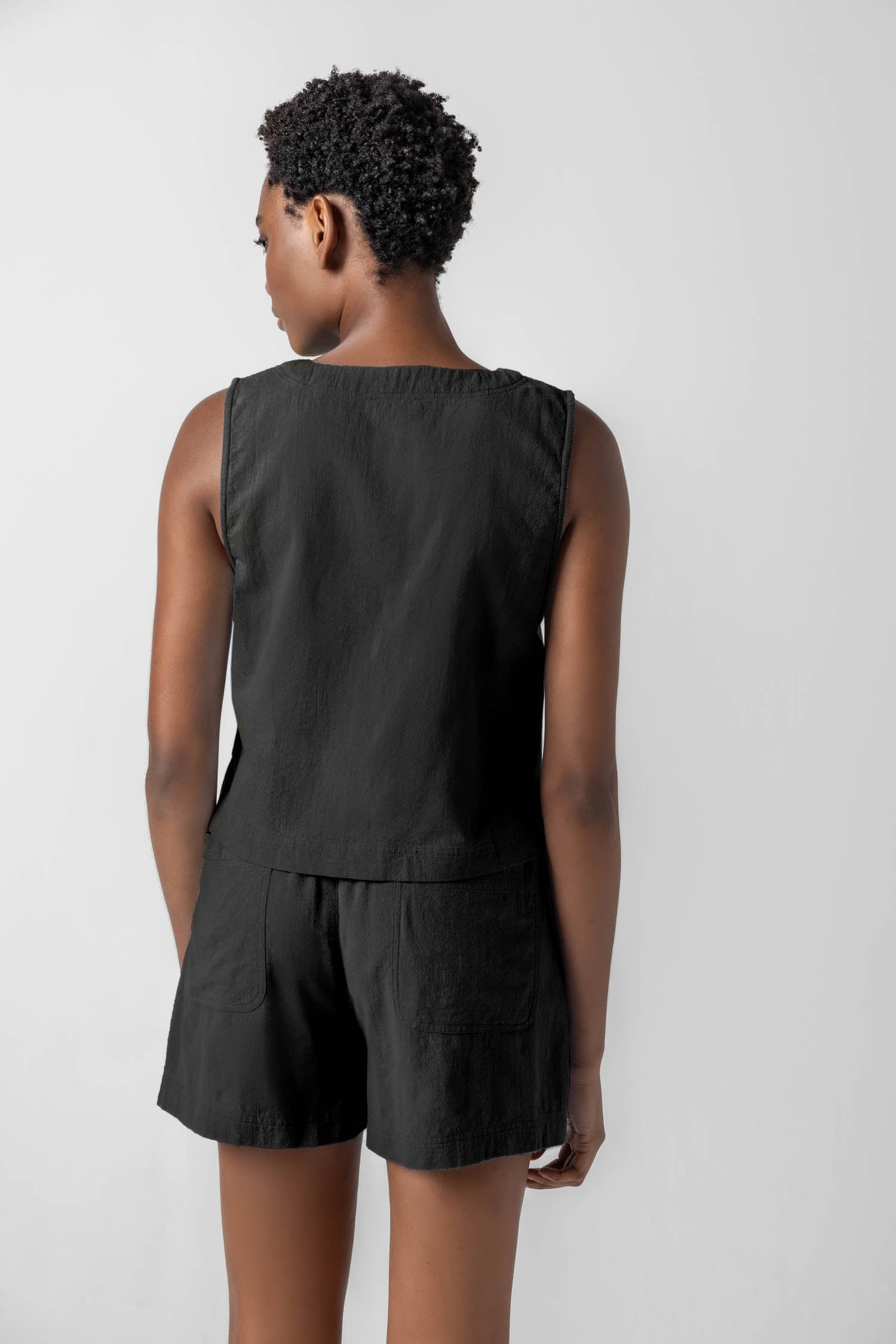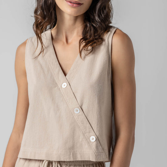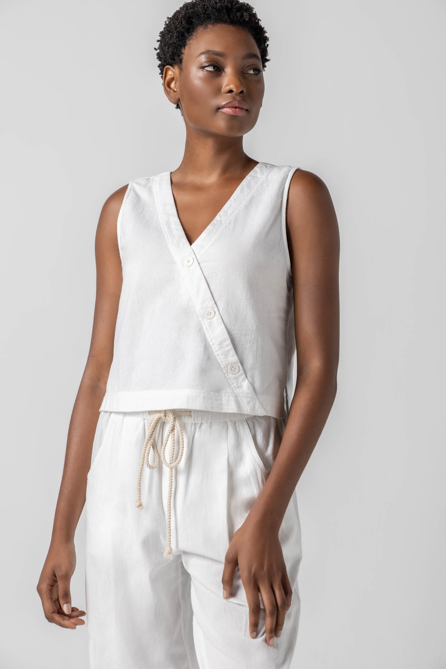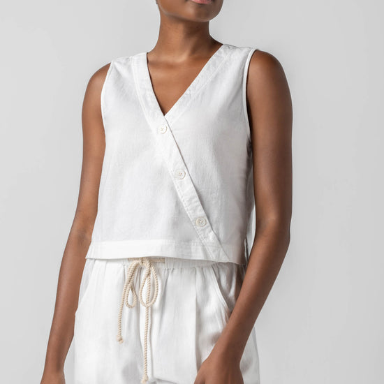 Elevate your summer wardrobe with the Cross Front Sleeveless Top, designed in our new Air Textured Cotton fabric. This lightweight woven fabric features a subtle texture that adds depth, making it an ideal choice for warm, sunny days. This top has an asymmetrical placket and side slits for a distinctive touch, while its shorter silhouette pairs effortlessly with higher-waisted bottoms. Style it with the coordinating bottoms for a chic, head-to-toe summer look that balances comfort and refinement.