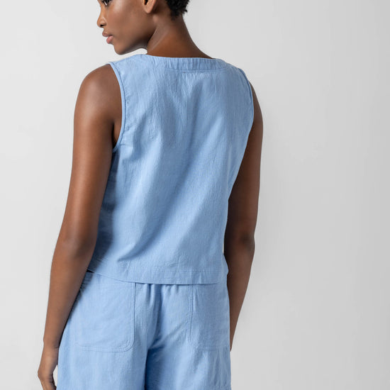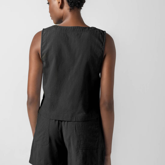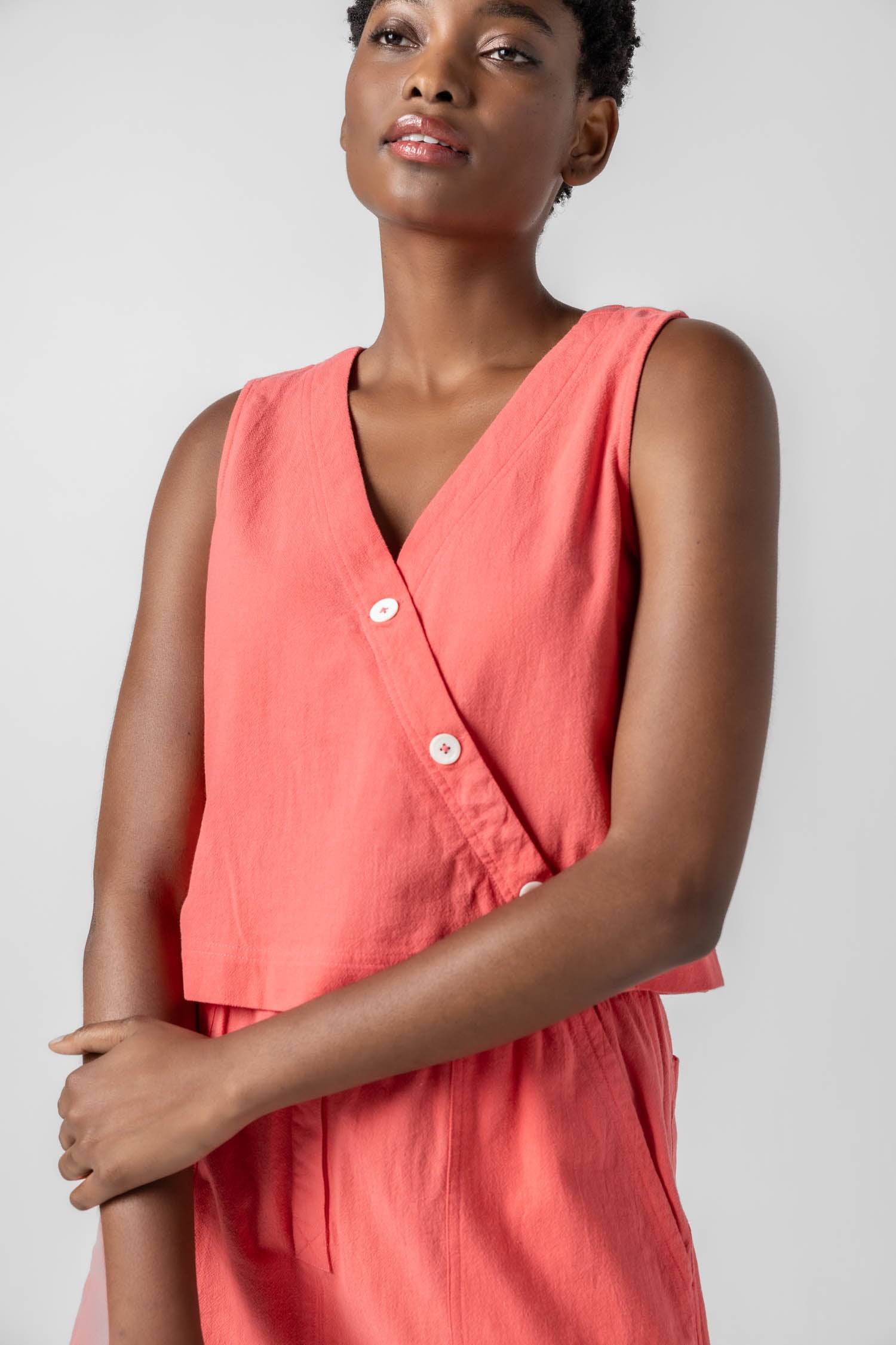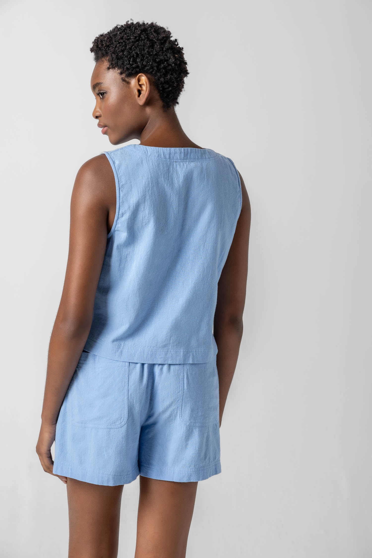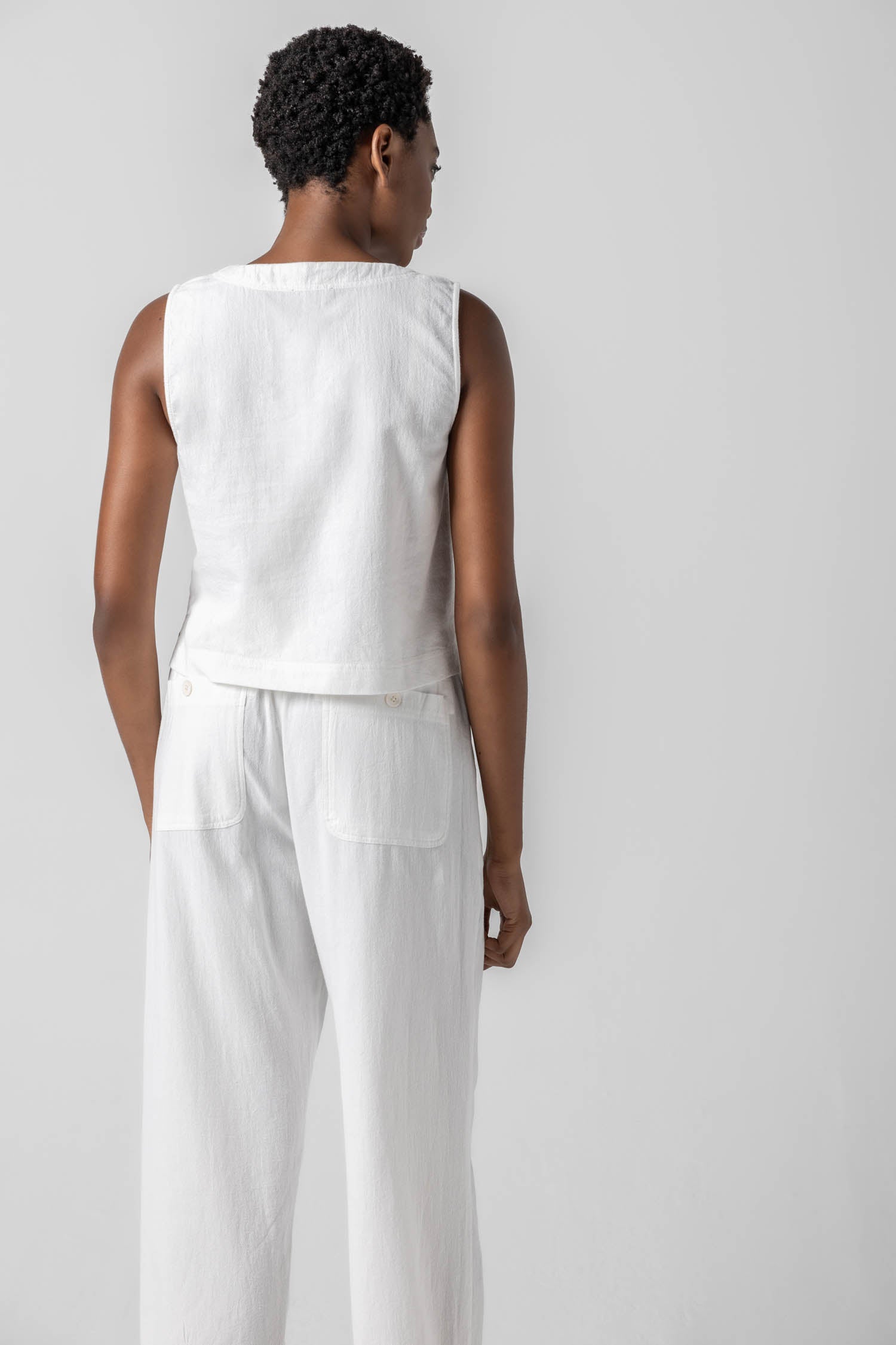 Elevate your summer wardrobe with the Cross Front Sleeveless Top, designed in our new Air Textured Cotton fabric. This lightweight woven fabric features a subtle texture that adds depth, making it an ideal choice for warm, sunny days. This top has an asymmetrical placket and side slits for a distinctive touch, while its shorter silhouette pairs effortlessly with higher-waisted bottoms. Style it with the coordinating bottoms for a chic, head-to-toe summer look that balances comfort and refinement.