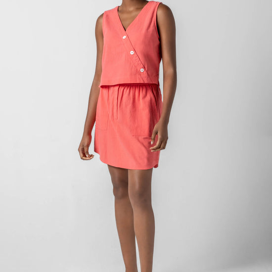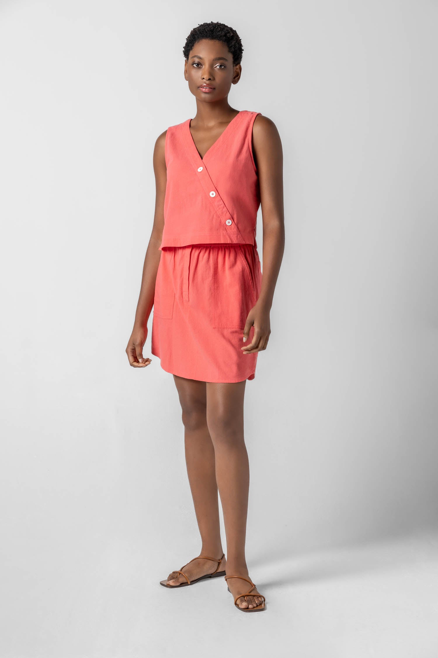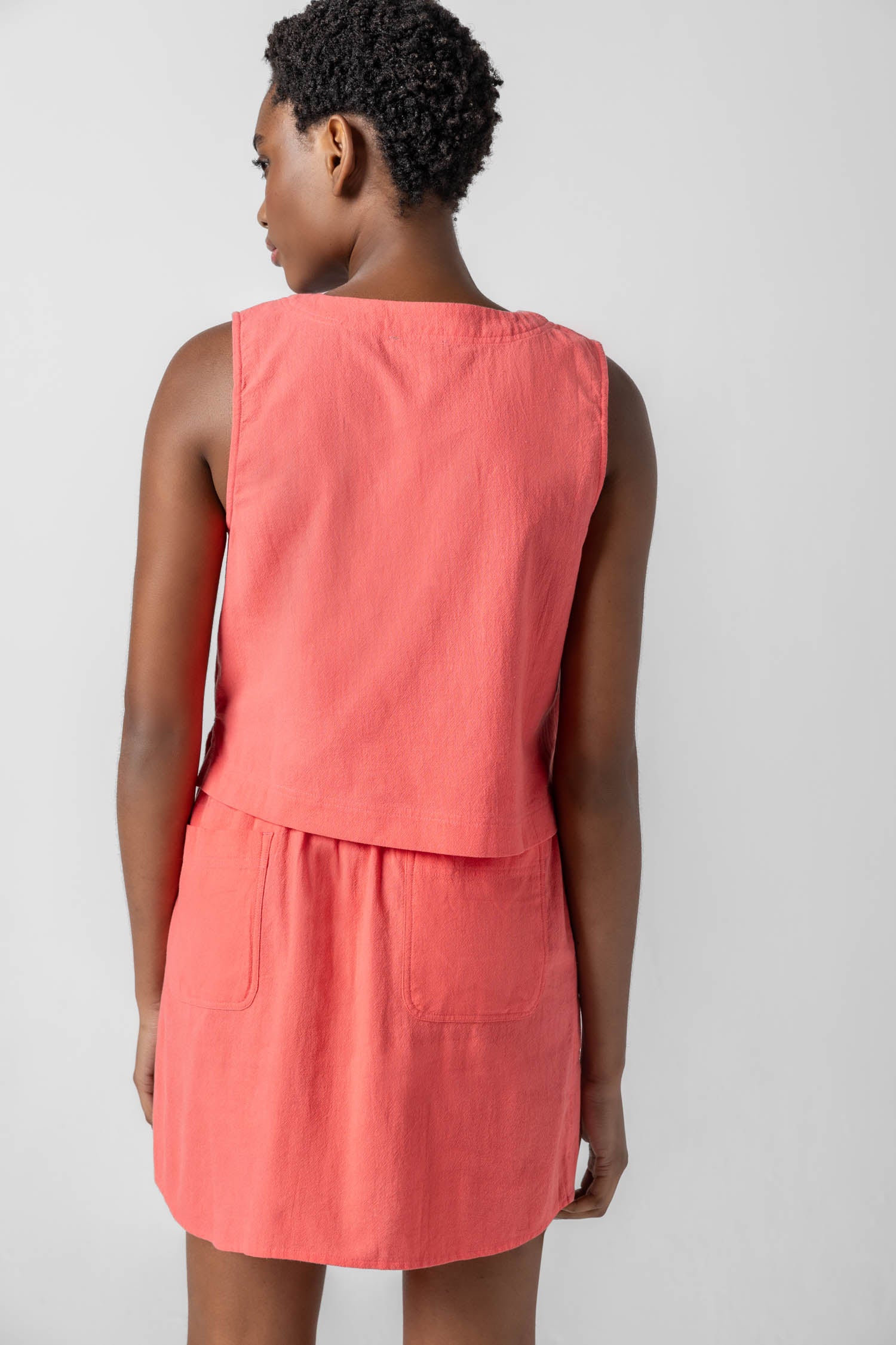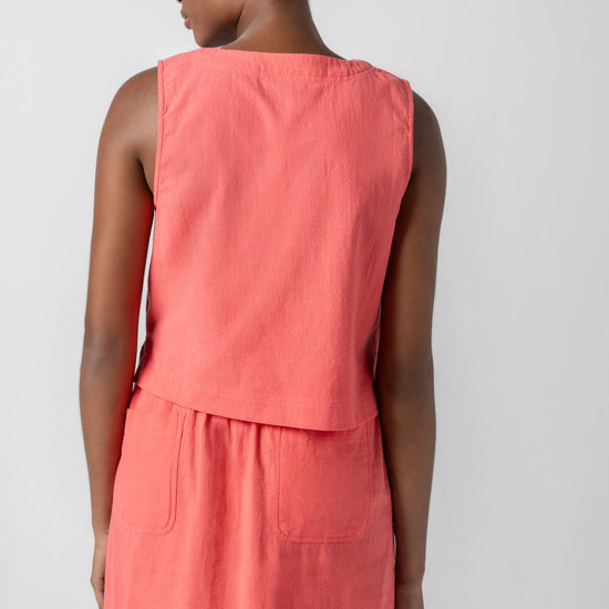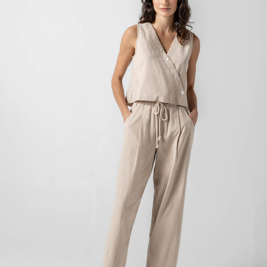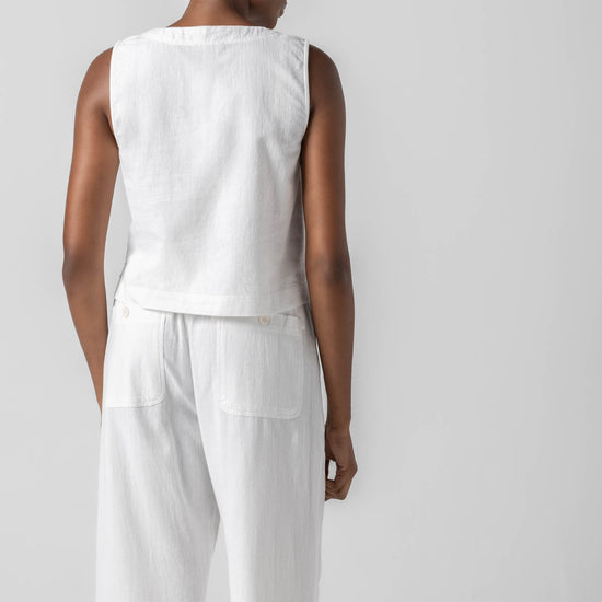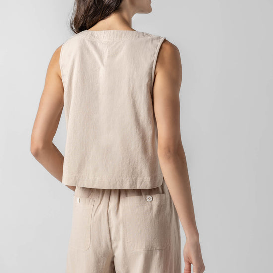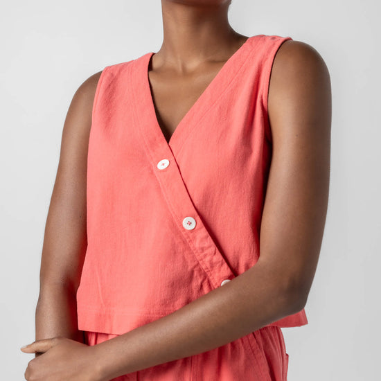 Elevate your summer wardrobe with the Cross Front Sleeveless Top, designed in our new Air Textured Cotton fabric. This lightweight woven fabric features a subtle texture that adds depth, making it an ideal choice for warm, sunny days. This top has an asymmetrical placket and side slits for a distinctive touch, while its shorter silhouette pairs effortlessly with higher-waisted bottoms. Style it with the coordinating bottoms for a chic, head-to-toe summer look that balances comfort and refinement.