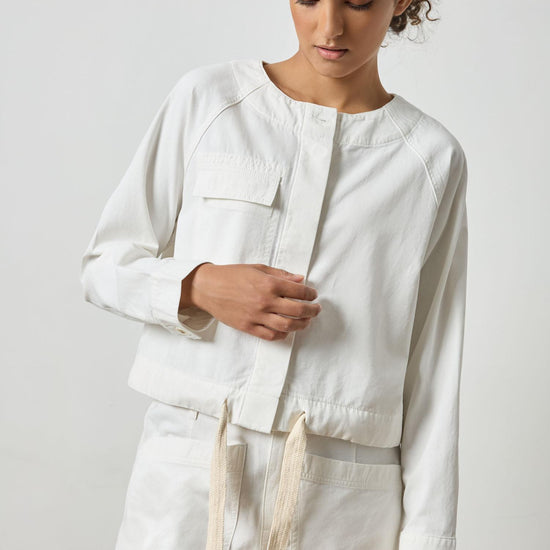 Our Drawstring Waist Jacket in lightweight cotton twill offers a relaxed fit with refined details. With raglan sleeves and low armholes for an easy fit, this shorter jacket has a facing around the collar and a covered placket for a clean, polished finish. The natural color braided drawcord at the hem allows you to adjust the fit to your liking. Pair it with the coordinating separates in the same fabric for a stylish head-to-toe look.