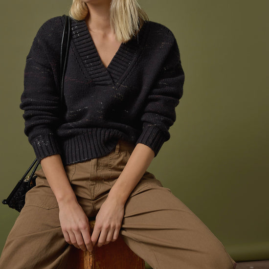 The Oversized V-Neck Sweater in our Space Dyed yarn is super soft, warm, and effortlessly unique. Made mostly of cotton, this yarn offers comfort with a novel space-dye effect that pairs beautifully with both satin and cotton twill for endless styling possibilities. Designed with a wide rib trim and dropped shoulders, this sweater has a relaxed, oversized fit, making it a versatile staple for any wardrobe.